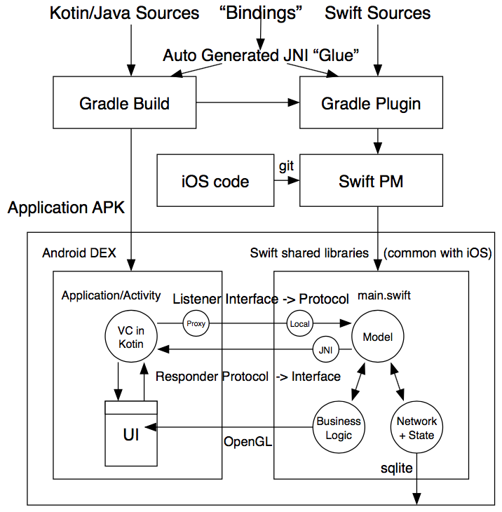 A hybrid app is a conventional Android Java app that loads a swifthello.so dynamic library on initialisation. The developer specifies a pair of Java interfaces to communicate to and from Swift and a code generator genswift.sh generates Swift sources to realise the JNI calls to implement these protocols. The interface for messaging from Java to Swift must have a name that ends in "Listener" and the interface in the opposite direction is normally the "Responder".
