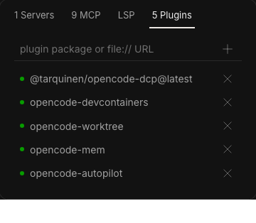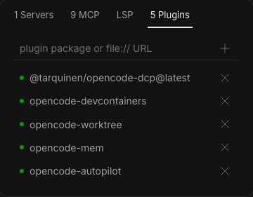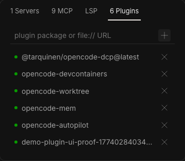 bun run --cwd packages/app typecheckPluginstab and validated add/remove path via new inputScreenshots / recordings