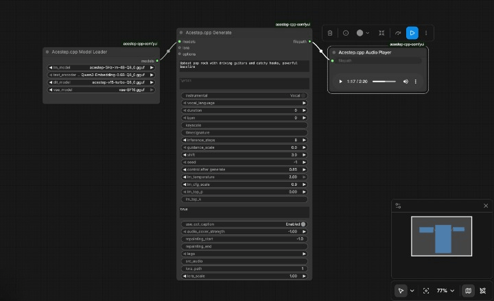 After installing this custom node package, drop the Acestep.cpp Builder node onto your canvas and click Queue. It will:
