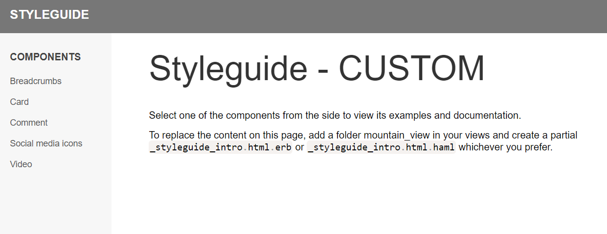 Screen capture of the style guide with a custom partial from my local copy of mountain_view_demo. This is for pull request #71. I'm fairly new to rails/ruby development, so please let me know if I violate best practice.
