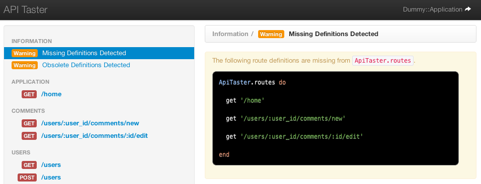 Instead of manually finding out which route definitions you need, API Taster provides a warning page that shows you all the missing definitions.
