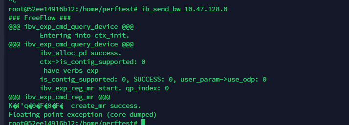 I'm reproducing freeflow on my own machine, and when I run ib_send_bw in two containers located at the same physical machine, Floating point exception(core dump) occured. The error is also in two containers located at two machines while these two machines can run ib_send_bw correctely.