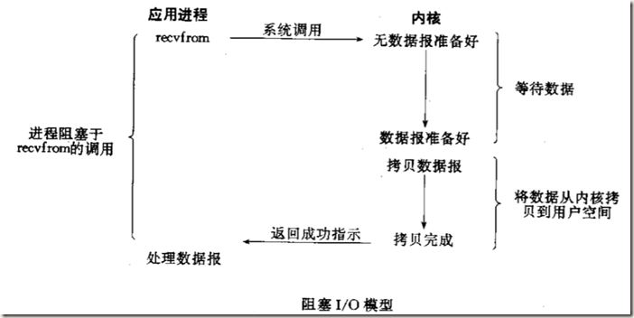 进程调用recvfrom,其系统调用直到数据报到达且被拷贝到应用进程的缓冲区中或者发生错误才返回。进程从调用recvfrom开始到它返回的整段时间内是被阻塞的。recvfrom成功返回后,应用进程开始处理数据。