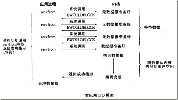 前三次调用recvfrom时没有数据可返回,因此内核转而立即返回一个EWOULDBLOCK错误。第四次调用recvfrom时已有数据报准备好,它被拷贝到应用进程缓冲区,recvfrom于是成功返回。我们接着处理数据。