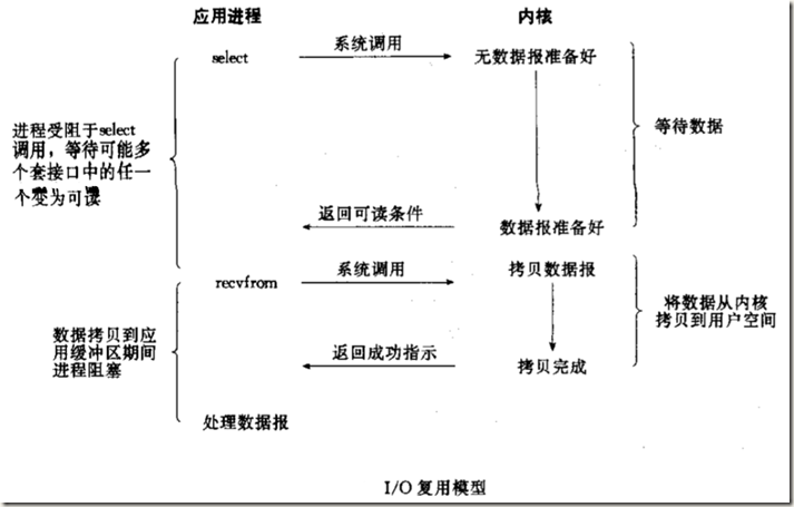 我们阻塞于select调用,等待数据报套接口变为可读。当select返回套接口可读这一条件时,我们调用recvfrom把所读数据报拷贝到应用进程缓冲区。