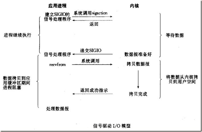 首先开启套接口的信号驱动I/O功能,并通过sigaction系统调用设置一个信号处理函数,该系统调用立即返回。进程继续工作,也就是说它没有被阻塞。当数据报准备好读取时,内核就为该进程产生一个SIGIO信号。随后既可以在信号处理函数中调用recvfrom读取数据报,并通知主循环数据已准备好待处理,也可以立即通知主循环,让它读取数据报。