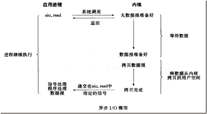 我们调用aio_read函数(POSIX异步I/O函数以aio_或lio_开头),给内核传递描述字、缓冲区指针、缓冲区大小(与read相同的三个参数)、文件偏移(与lseek类似),并告诉内核当整个操作完成时如何通知我们。该系统调用立即返回,在等待I/O完成期间,我们的进程不被阻塞。