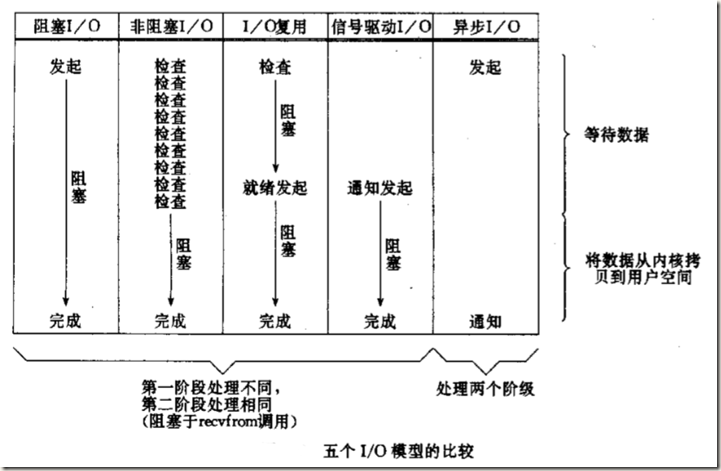 前4种模型主要区别在第一阶段,它们的第二阶段都是一样的:在数据从内核复制到调用者的缓冲区期间,进程阻塞于 recvfrom 调用。